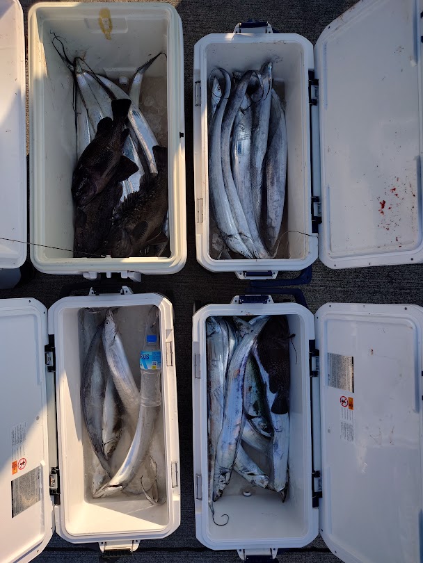 9月24日 広田湾 海水温24.1℃6時~13時までの釣果 タチウオ F2.5〜F4 船中10匹 0・2・2・6 ショッコ 30~32㎝ 船中 4匹 サバ 34㎝ 船中 1匹 リリースで…