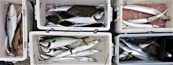 8月9日 気仙沼沖~(広田)22.3~23.2℃ 6時~14時までの釣果 タチウオ F3.5~F4.5 船中15匹 アイナメ 35~45㎝ 船中2匹 イナダ 55~57㎝ 船中5匹 ヒラメ …