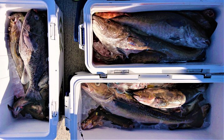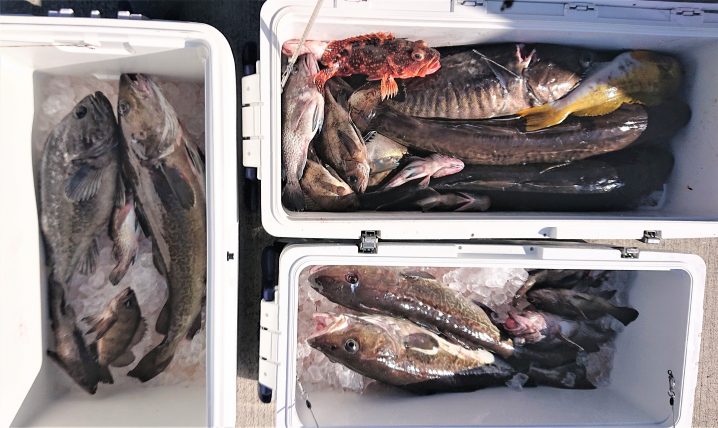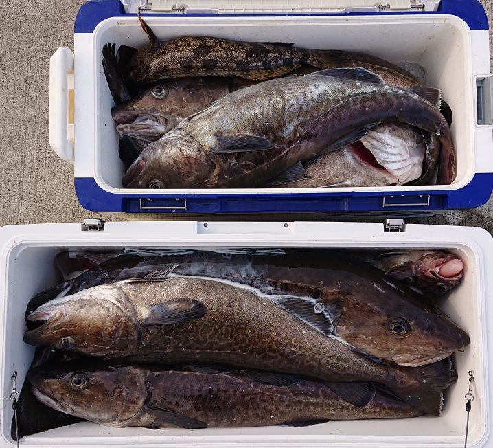 令和3年2月14日 広田沖~唐桑沖 海水温8.0℃ 澄み気味 6時半~14時までの釣果 マダラ 55~87cm5.5㎏ 船中 22匹 アイナメ 38~40cm 船中 2匹 ガヤ 25cm 船中 1…
