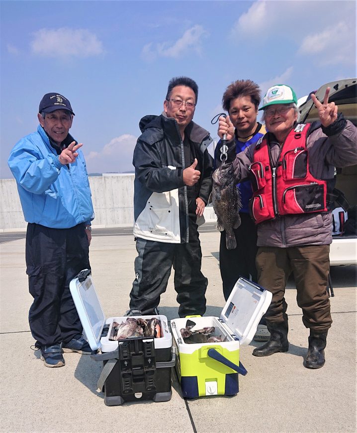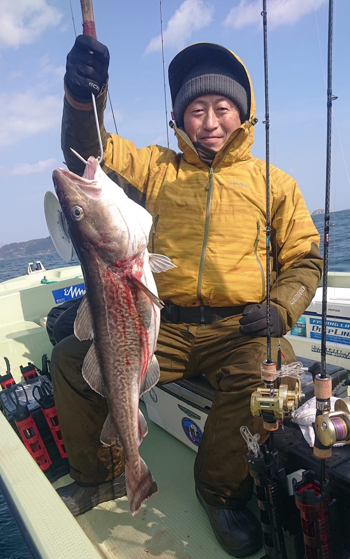 令和3年3月7日唐桑沖~広田沖 海水温5.5~6.7℃(水色)濁り6時~14時までの釣果 マダラ 60~77㎝ 船中 4匹 アイナメ 32~50㎝ 船中 5匹 クロソイ 47~50㎝ 船中 2匹 メバル 20~25㎝…