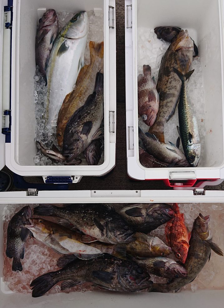 大島沖~広田沖 海水温16.8~18.2℃(水色)濁り気味 5時~14時までの釣果です。 ワラサ 61㎝ 船中1匹 アイナメ 32~49㎝ 船中4匹(リリース3匹) クロソイ 38~43㎝ 船中4匹 マ…