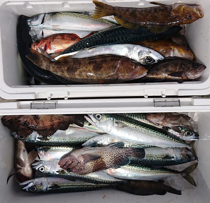 大島沖~唐桑沖 海水温11.4~12.3℃(水色)やや濁り気味 5時半~12時まで、朝のうち風は弱いですが波悪い中の釣果でした。 アイナメ 35~40㎝ 船中2匹(リリース4匹) サバ 34~40㎝ 船中…